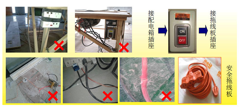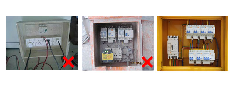 臨時(shí)用電必須公司標(biāo)配的配電箱(接入進(jìn)戶(hù)配電箱下樁頭),三相接線正確。引線必須固定,并確保內(nèi)部配件(漏電保護(hù)器等)完好,保持箱體內(nèi)外清潔